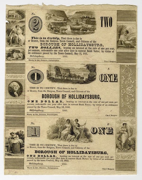 Hollidaysburg, PA., Uncut Sheet of 3 notes, $2; $1; $1; H 159-26; 159-24; 159-25, Remainders, AU to CU condition, Scarce notes rarely seen at auction. The $1 note has 2 significantly different varieties. This is possibly the only appearance of this or similar sheets since 1997. (ex-Smythe, 1997 Memphis Sale #165, Lot 1223).