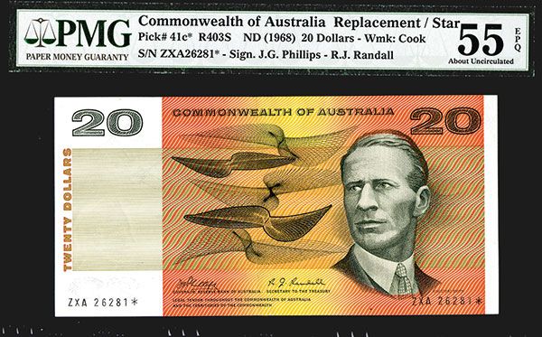 Australia, ND (1968), $20 Star Note, P-41c*, R403S, RH1, Phillips | Randall signatures, S/N ZXA 26281*, PMG graded AU 55 EPQ. Amazing condition for this rare replacement note.