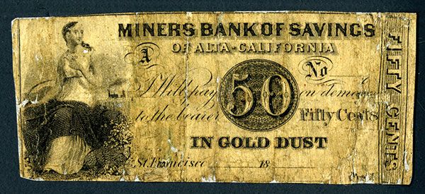 San Francisco, California, ND (ca.1850's). 50 cents, Ser. A, P-Unlisted. Unissued remainder obsolete banknote, black with no underprint, seated allegorical reaper on left, Payable “In Gold Dust”, the note has been backed to reinforce the fragile paper that was splitting, but there are only very small edge faults on the bottom and top and the note is still very attractive and is missing from most advanced collections. The note would grade Good to Good+ with faults. Rare note in any grade and almost impossible to find anything from this time period from the California Gold Rush Era.