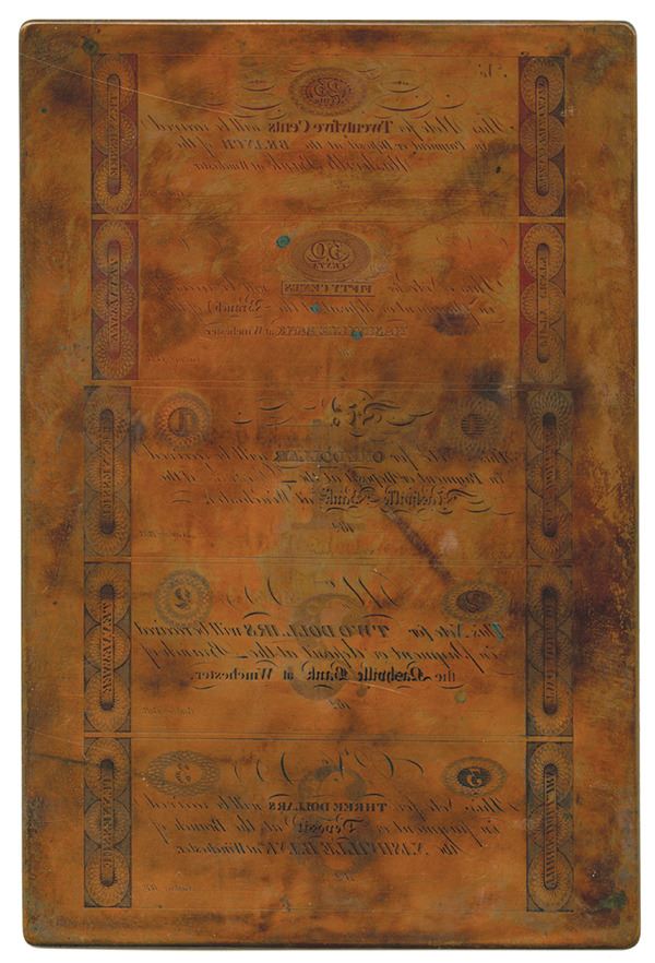 Nashville (at Winchester), Tennessee, 182x (1820-24), Copper printing plate with 5 different banknotes. Includes 25cts-50cts-$1-$2-$3, (TN-180-Unlisted). No 25cents; 50 cents or $3 denomination notes are known on this bank, Unlisted design, printer, and denominations only add to the desirability of this amazing and unique printing plate from the 1820's, the back is blank, the plate is in amazing shape with original golden-red patina with evidence of a cleaning sometime in the distant past. The 25 cents and 50 cents notes have a denomination counter in the top middle and end panels with Tennessee and the denomination; the $1, $2 and $3 notes have a place for the serial number at the top middle and an underprint of the numeral denomination for that note and also similar end panels as the lower denomination, all are payable at Winchester. 8.5 by 12.5 inches, Unique copper printing plate from a new estate find and the first time ever offered in public auction. This is one of 2 banknote plates and 3 advertising plates we are offering. William Kneass ran an engraving office on Fourth above Chestnut Street, Philadelphia, which was a popular meeting place for "leading wits and men of culture" up until he was appointed the second Chief Engraver of the United States Mint on January 29, 1824 until his death in 1840. In 1834, Kneass designed the Classic Head motif which appeared on Quarter Eagle ($2.50) and Half Eagle ($5.00) gold pieces from 1834-1839. He also modified John Reich's Capped Bust design on the dime through half-dollar for the years 1829-1837. Additionally, Kneass utilized his modified Capped Bust for the rebirth of the half-dime in 1829. He also introduced a new Liberty head on the half dollar, a design that was modified several times over the next two years, The printer is W. Kneass, Philadelphia. Historic obsolete banknote plate engraved by legendary U.S. Mint engraver.