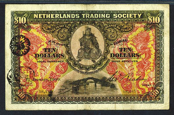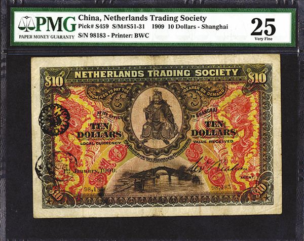 Shanghai, China, $10, P-S459 (S/M#S51-31), Issued banknote, Black on red underprint, medieval oriental warrior in middle over bridge on bottom middle, back is red on light blue on m/c with facing dragons on top, PMG graded Very Fine 25, Purple circular hand stamp in middle-left, rare note in any condition and rarely found issued. BWC.