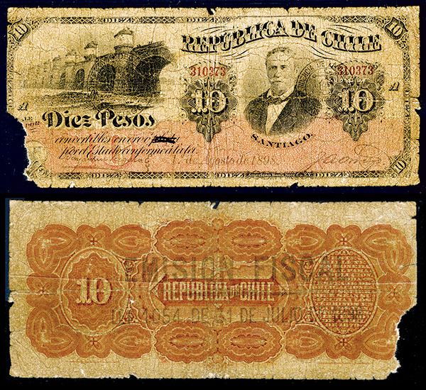 Santiago, Chile. August 1, 1898, 10 Pesos, P-54Aa, Overprinted on Chile 21, Issued banknote, President J.J.Perez at right, towered bridge at left, back red-brown with "EMISION FISCAL - LEI 1.054 DE 31 DE JULIO 1898" in black, the face has "Plata" (Silver) crossed out so that this note was payable in "Oro" (gold) only, S/N 310373, 2 hand written signatures at bottom and circular stamp to right of portrait, PMG graded Good 4 NET with notation of missing corner, Discovery note from 1898 that has finally seen the light of day, this note is very possibly unique and may be the only opportunity to help complete an entire collection of Chile banknotes. ABNC.