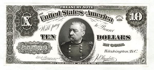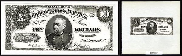 Legal Tender Treasury Note. 10 Dollars, Fr.#366 unlisted as such, unpublished in Hessler. Unique Proof from presentation album. Philip Henry Sheridan at center, Rosecrans | Huston signatures, "000000" pin-punch numerals on lower left and upper right serial number locations, no plate letter. The note is printed in black ink on thin white paper without any underprint. Trimmed to final note size, blank back. Mounted on a white thin card stock album page. The presentation album which this note was taken from may have been printed ca. 1906-7 as the latest notes offered from it were 1906 issues. The note has exceptional paper quality, bold ink tone and impressive design with very light wrinkling at left margin, otherwise Choice to Gem Quality Uncirculated. A trophy note of the highest order for the large size collector. (Ex Stack's Americana Sale, 9.2010, Lot 1097}.