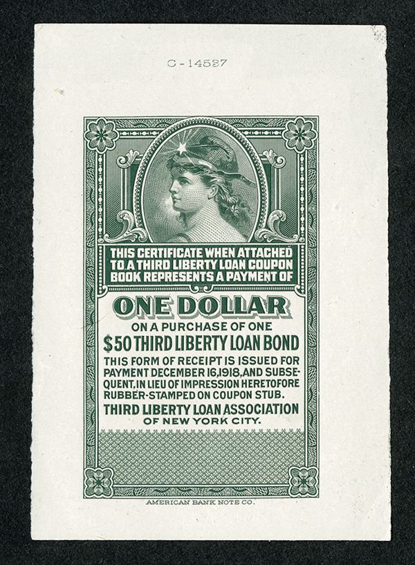 New York City, New York. 1918. $1. Text states "This certificate when attached to a Third Liberty Loan Coupon Book Represents a Payment of One Dollar on a purchase of one $50 Third Liberty Loan Bond". Large Die Proof printed in green on india paper. Plate # C-14537. Choice uncirculated condition. ABNC. Rare Liberty Loan proof stamp in pristine condition. (From the collection of John E. Herzog)