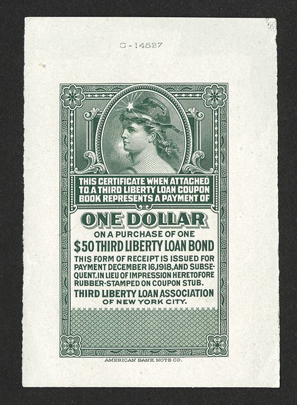 New York City, New York. 1918. $1. Text states "This certificate when attached to a Third Liberty Loan Coupon Book Represents a Payment of One Dollar on a purchase of one $50 Third Liberty Loan Bond". Large Die Proof printed in green on india paper. Plate # C-14537. Choice uncirculated condition. ABNC. Rare Liberty Loan proof stamp in pristine condition. (From the collection of John E. Herzog)