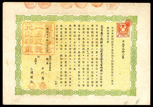 Y50 certificate of deposit, issued by the 102nd National Bank, Nagasaki, Meiji 12[1879].1.28. Many transfers recorded on the back.