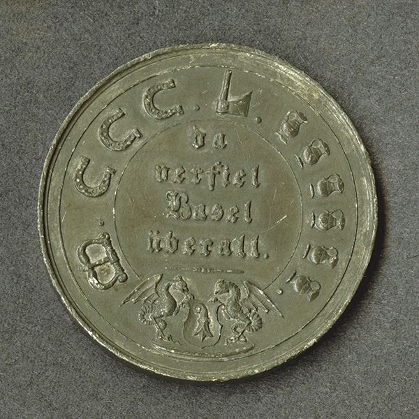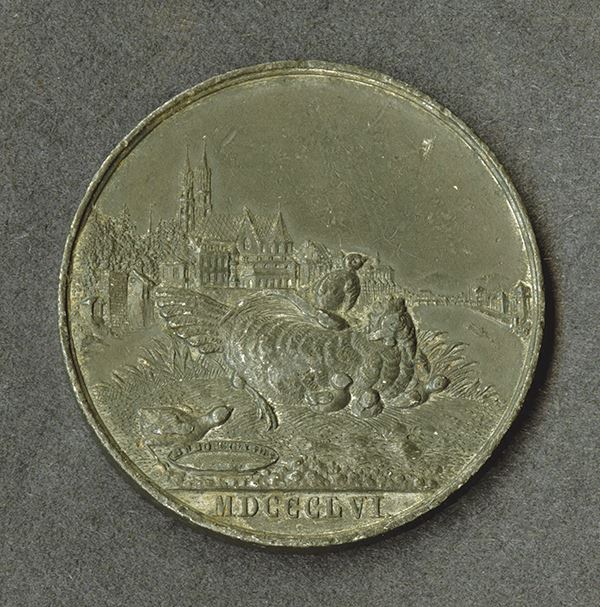 Switzerland. Base metal, 45mm. Town view with mother hen and chicks around. Chronogram date with horse shoes, ave and jugs. Very Fine.
