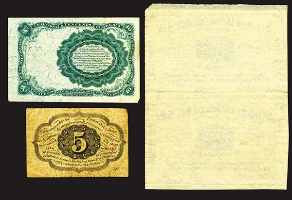 Lot of 3 items, Includes 1868, La Crosse, Wisconsin Uncut pair of $1 Lottery tickets for Stanley’s 18th Annual Gift Sale at Pomeroy's Opera House, Esperson's Brick Block, prizes include Farms, Diamonds, Pianos, Fine Watches, Sewing Machines, etc. Blue with building in middle, Choice XF/AU. Also includes Low Fractional Banknote pair, 5 cents, 1st issue and 10 cents, 5th issue in Fine to VF.
