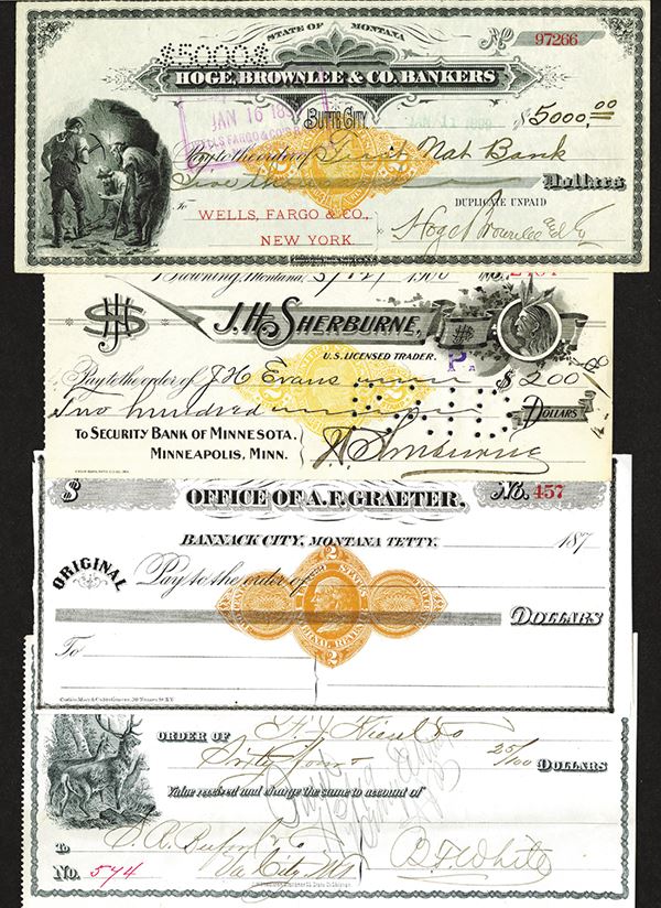 MT. Checks on Hoge, Brownlee & Co.; J.E. Sherburne; A.F. Greater; U. & N Ry Co. First three with imprinted revenue stamps. 4 pieces.