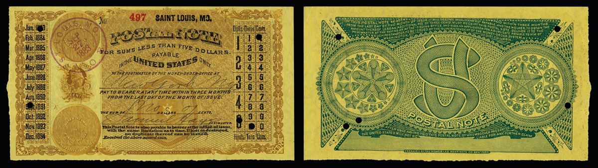 Saint Louis, Missouri, September 27, 1883, 1 issued and uncancelled postal note, black printing on yellow paper, a 3 "Fee" Revenue stamp engraved as part of the design on the left; purple Saint Louis, MO postal handstamp on the top left that was added when issued, S/N 497; back printed in green by Homer Lee Bank Note Co., NY; Choice XF to AU condition and attractive.