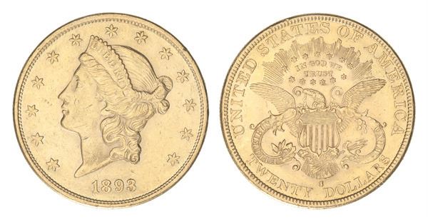 1893-S, $20 Liberty Double Eagle, AU-Uncirculated,