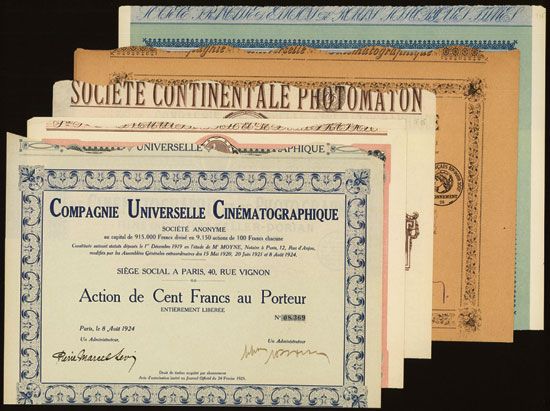 France, 1920's, Issued Bonds with Coupons Attached, 1) Two Compagnie Universelle Cinematographique 2) Societe Francaise D'Editions de Romans Historiques Filmes 3) Societe Continentale Photomaton, Societe Francaise de Cinematographie et de Photographie, VF condition.