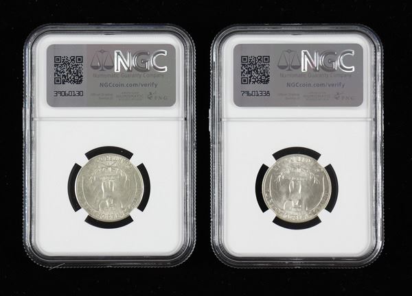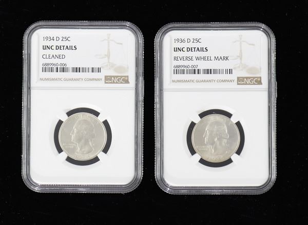 two coins, the first CLEANED, the second REVERSE WHEEL MARK, NGC graded Uncirculated Details.