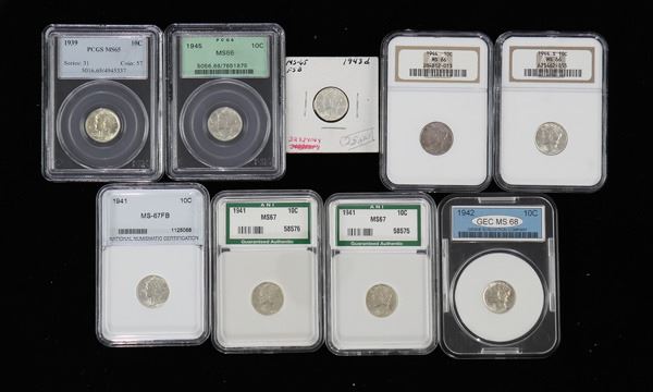 all but 1943-D Graded, PCGS: 1939 MS 65; 1945 MS 66, NGC: 1944 MS 66; 1944-S MS 66, NNC: 1941 MS 67 FB, ANT: 1941 MS 67; 1941 MS 67, GEC: 1942 MS 68 (11). Shipping charges apply - weight 0.9 lbs.