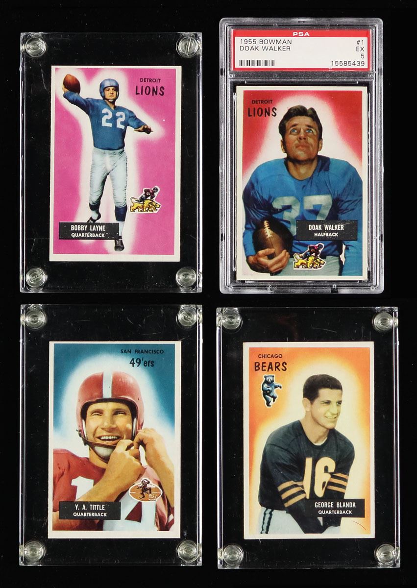 comprising 1955 Bowman #1 Doak Walker PSA 5 EX, 1955 Bowman #72 Y. A. Tittle, 1955 Bowman #71 Bobby Layne, & 1955 Bowman #62 George Blanda; raw cards are in VG-EX condition; see images to judge for yourself.