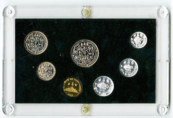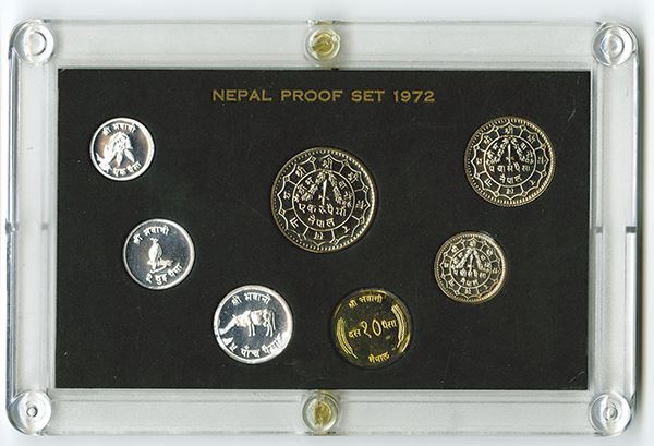 Nepal. KM PS5. Includes: KM#799, 801, 802, 807, 815, 821, 828. In official plastic holder and card case with card insert. Mintage of 3,943. Stuck at the U.S. Mint. Proof, a bit of tone on the brass and fogging on the aluminum, as warned on the card. 7 coins in set.