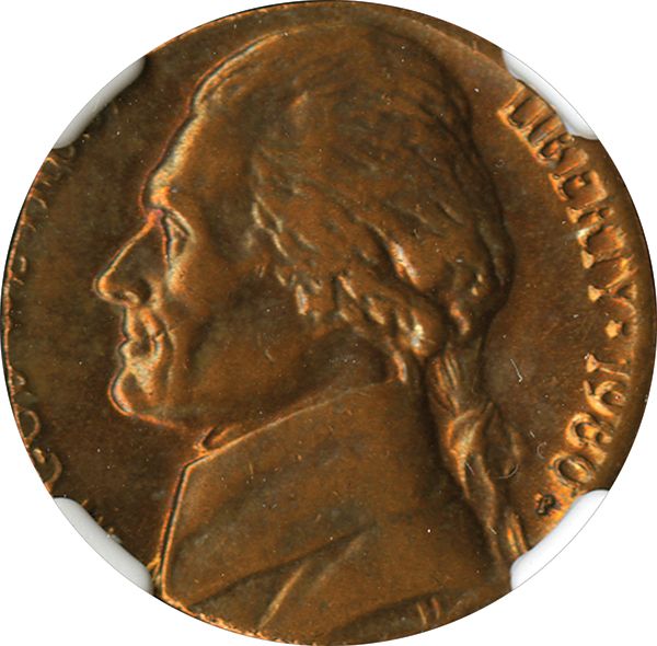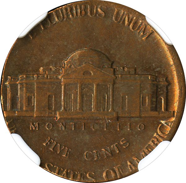 1980 Jefferson Nickel Struck on Cent Blank. Graded Mint Error NGC AU 58 BN.