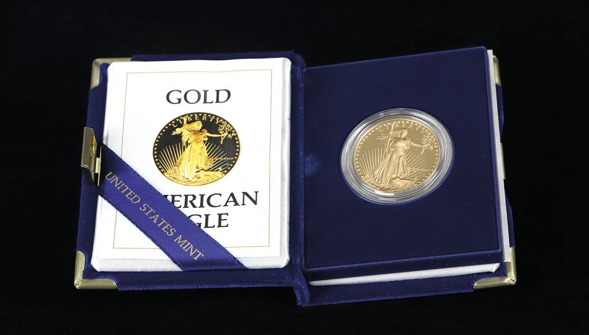 Superb Gem Frosted Proof, in original mint packaging; Fineness: 91.67% Gold, 3.00% Silver, 5.33% Copper, 1.091 troy ounce (33.931g).