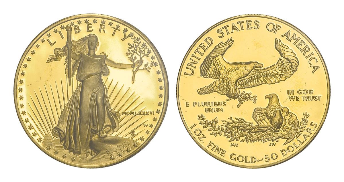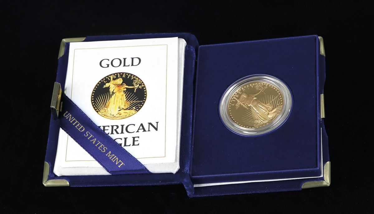 Superb Gem Frosted Proof, in original mint packaging; Fineness: 91.67% Gold, 3.00% Silver, 5.33% Copper, 1.091 troy ounce (33.931g).