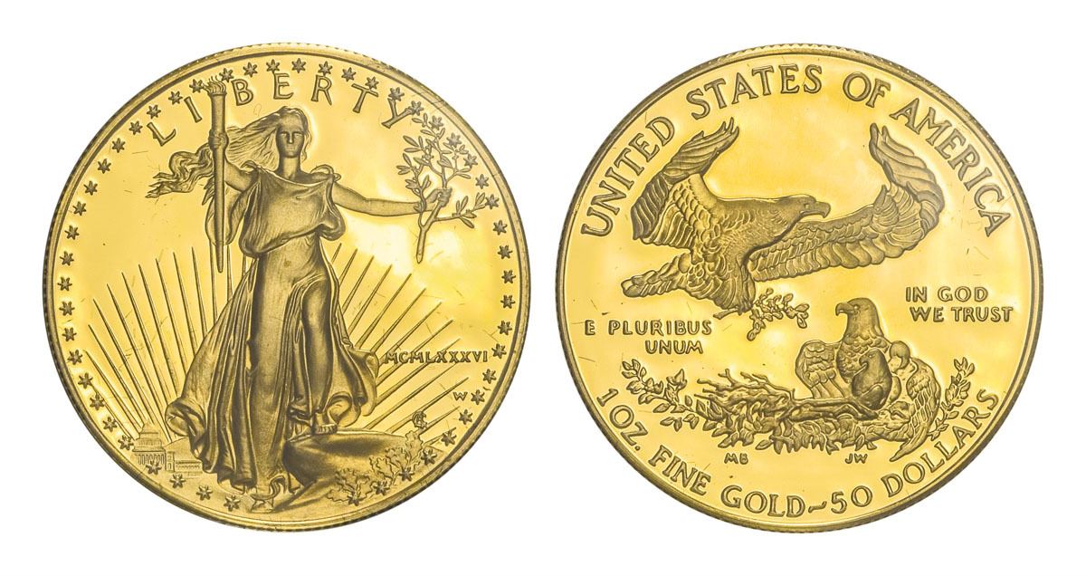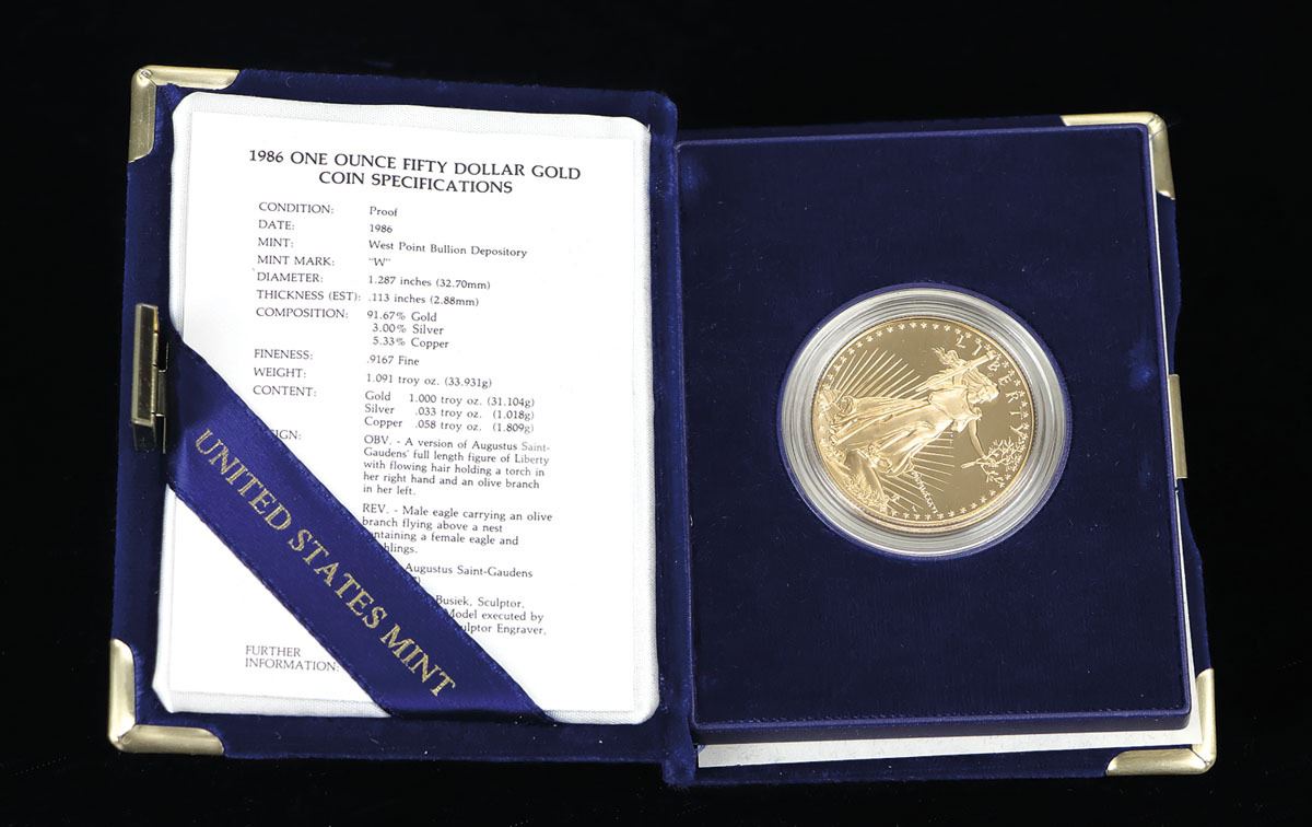 Superb Gem Frosted Proof, in original mint packaging; Fineness: 91.67% Gold, 3.00% Silver, 5.33% Copper, 1.091 troy ounce (33.931g).