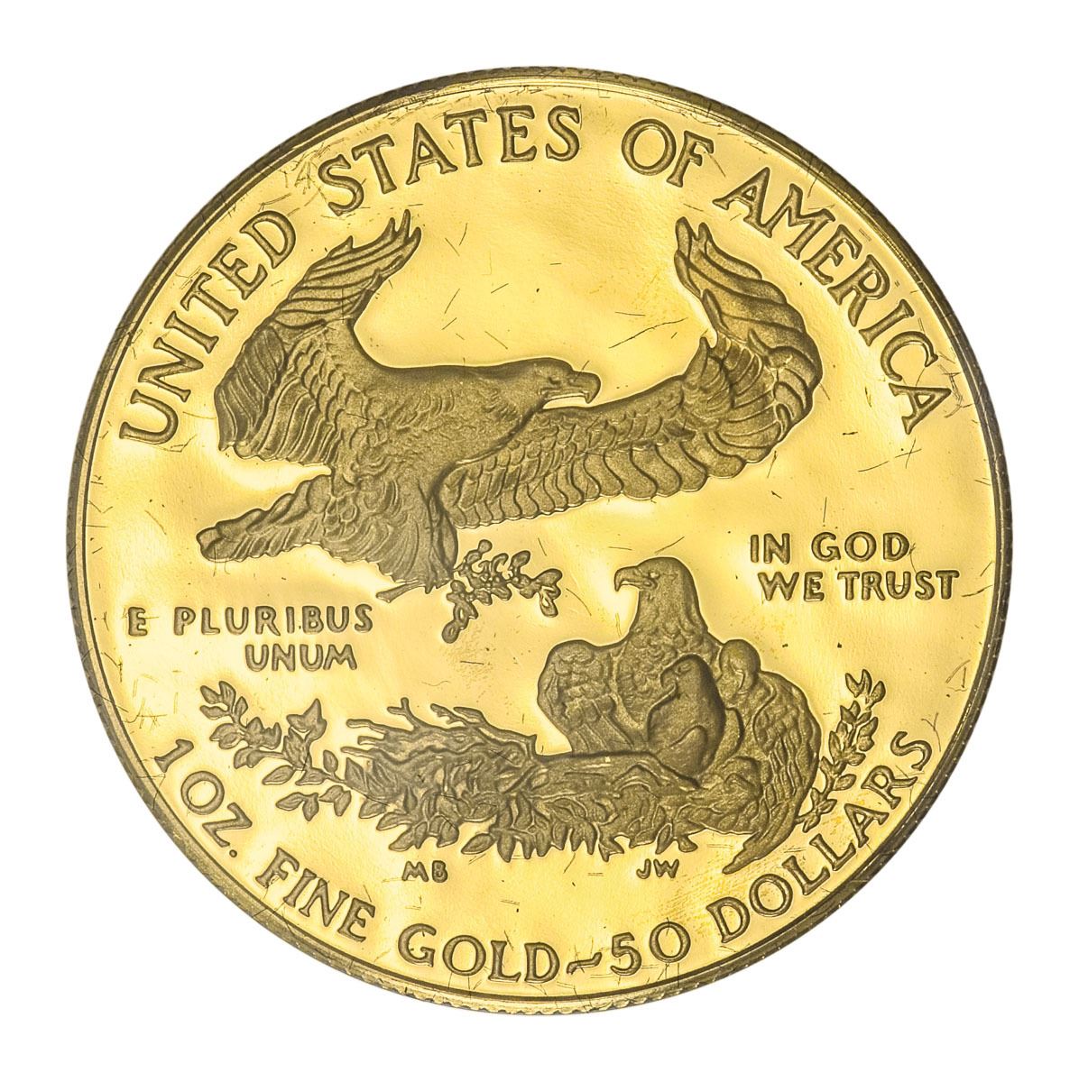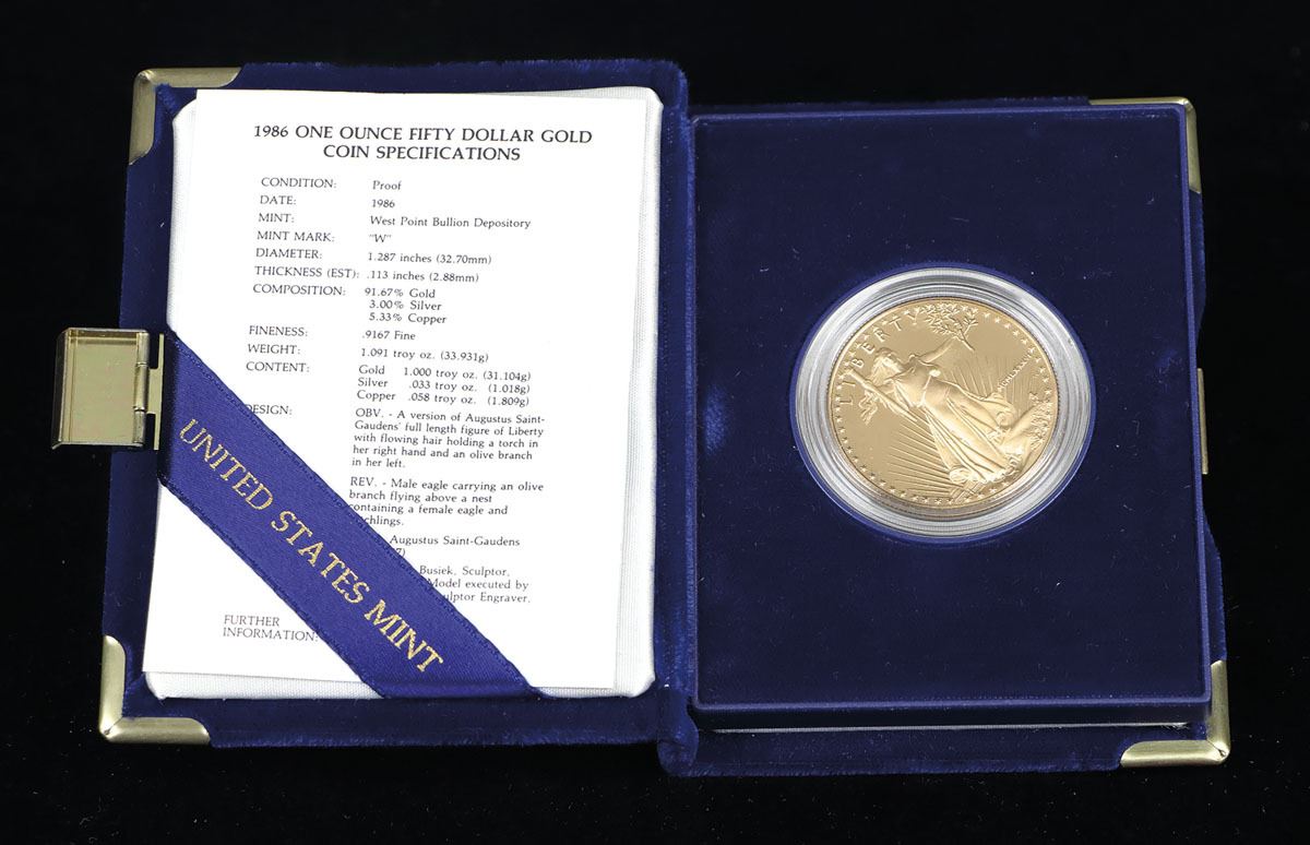 Superb Gem Frosted Proof, in original mint packaging; Fineness: 91.67% Gold, 3.00% Silver, 5.33% Copper, 1.091 troy ounce (33.931g).