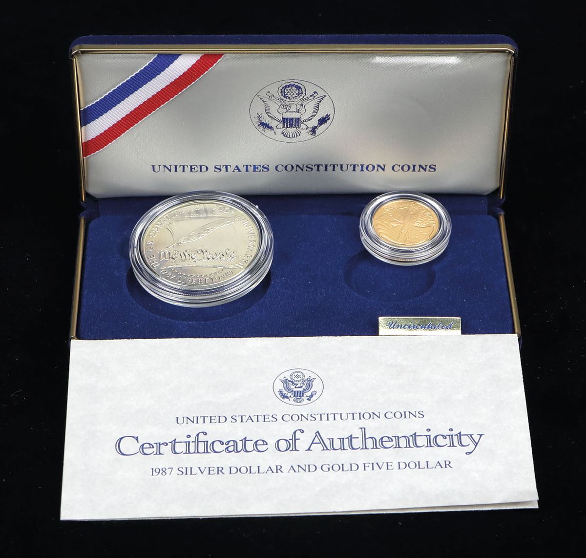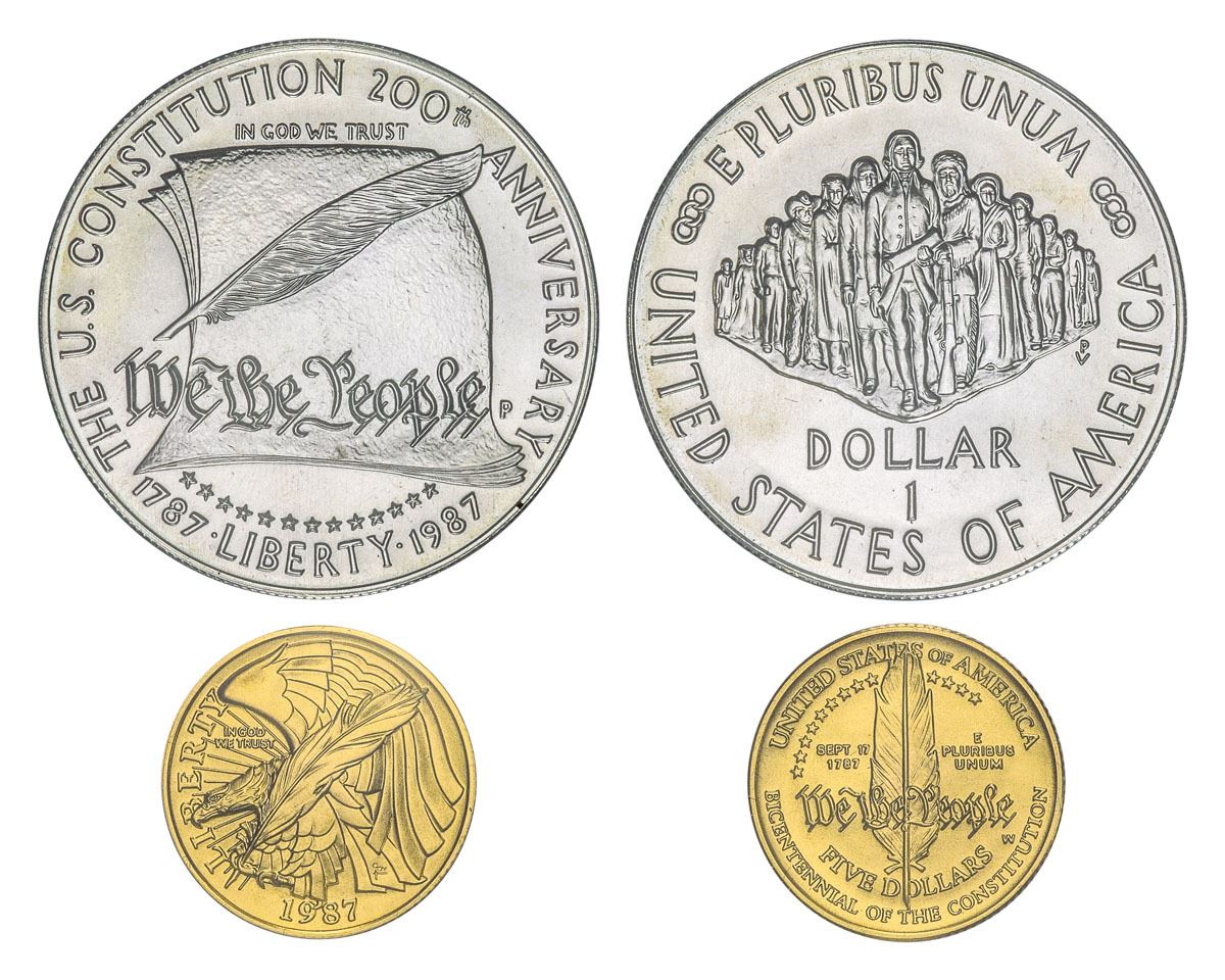 $1 Silver 1987-S and $5 Gold 1987-W in original packaging and appearing nearly flawless; Fineness 0.900% Gold, +/-2.00% Silver, 0.2687 troy ounce (8.359 g).