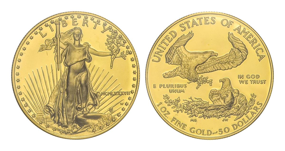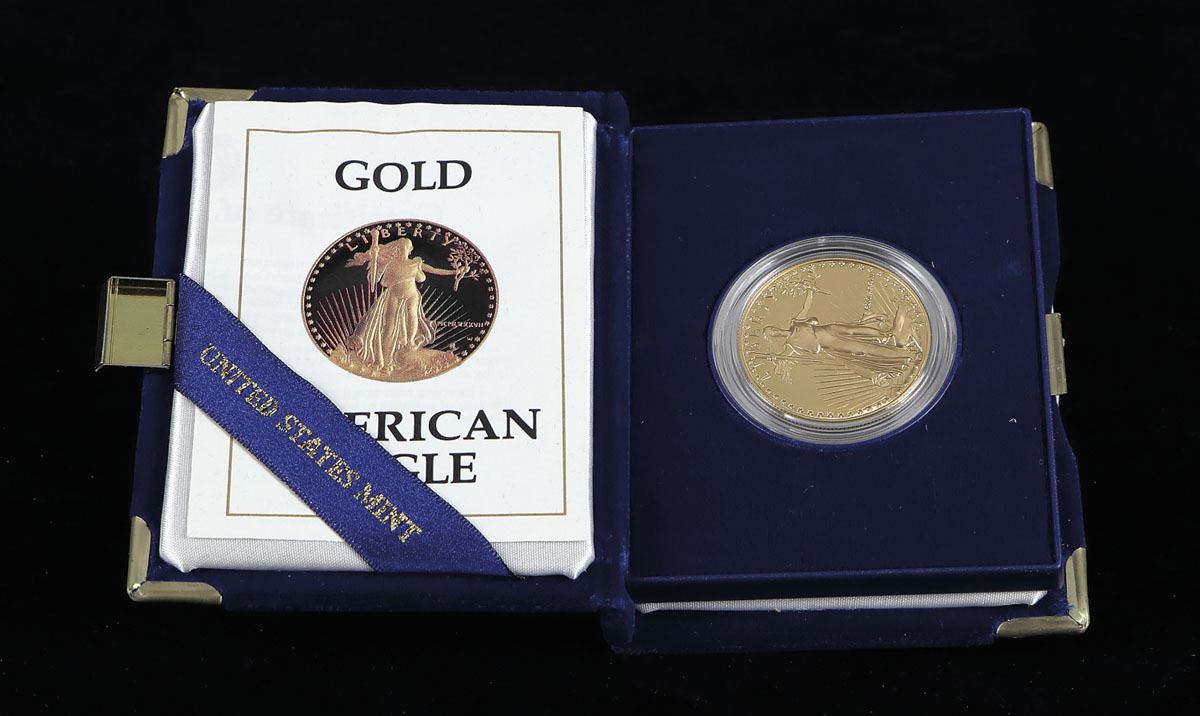 Superb Gem Frosted Proof, in original mint packaging; Fineness: 91.67% Gold, 3.00% Silver, 5.33% Copper, 1.091 troy ounce (33.931g).