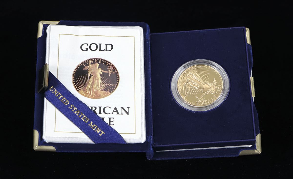 Superb Gem Frosted Proof, in original mint packaging; Fineness: 91.67% Gold, 3.00% Silver, 5.33% Copper, 1.091 troy ounce (33.931g).