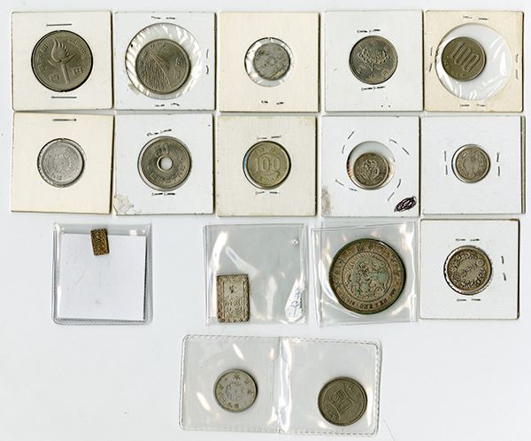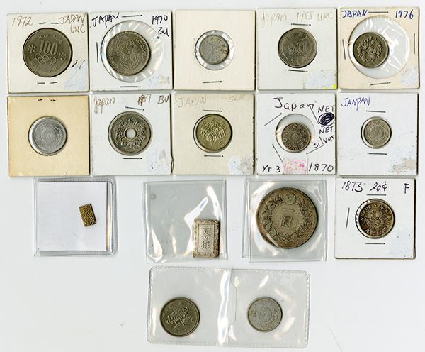 Lot of 16 issued coins, some silver, including 20 Sen, 1873, Fine; 10 Sen, 1870, VF; 10 Sen, 1912, XF-AU; 1 Yen, VF; 1 Bu (Ichibu), C#16 (1837-1854), VF-XF; and a small gold/silver 2 Bu, Choice VF. Also included are 10 20th century circulating coins. Sold as is, please inspect.