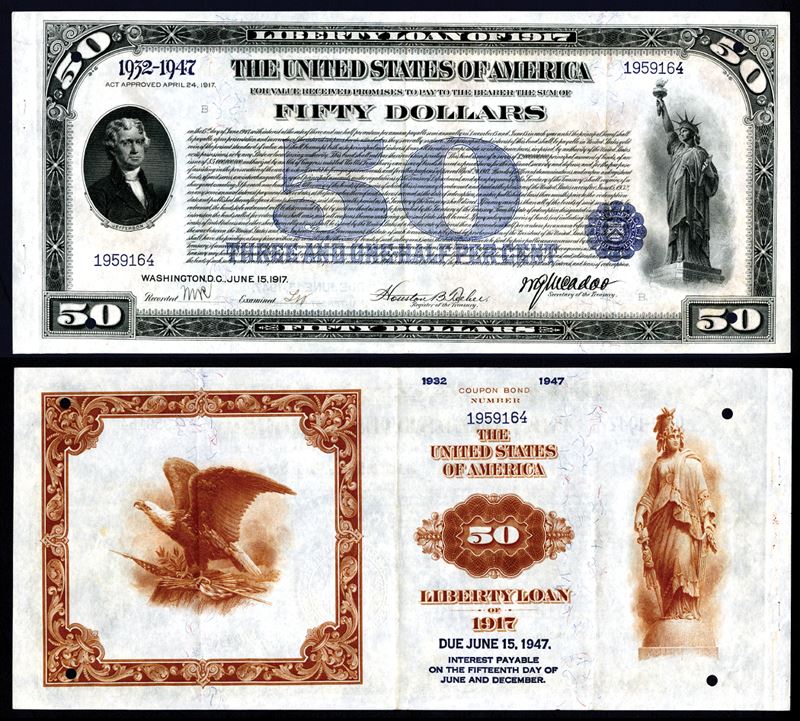 U.S LibertyÊÊLoanÊBond of Ê1932-1947, issued in 1917.ÊSerial number: 1959164.ÊBond GradesÊXFÊwith 4 hole punch cancel in the "$50.00" denomination on corners. Statue of Liberty on right and Jefferson on left on front, a majestic American Bald Eagle and "Columbia" on the reverse.ÊAlthough coupons absent. Bond would frame beautifully. Rarely seen cancelled. BEP