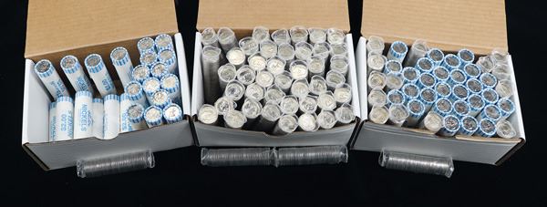112 Uncirculated rolls in paper and plastic wraps, as minted ($224 face value). Rolls list for $6 each in the GreySheet. (112 rolls). Shipping charges apply - weight 52 lbs. (photo on web site)