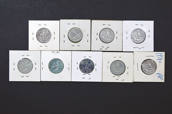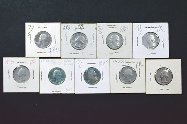 United States. Quarters: 1968S; 1970S; 1971S (2); 1972S (foggy); 1973S (verdigris); 1976S One greenish; another foggy); 1977S. 9 pieces.