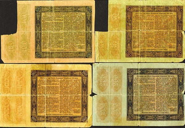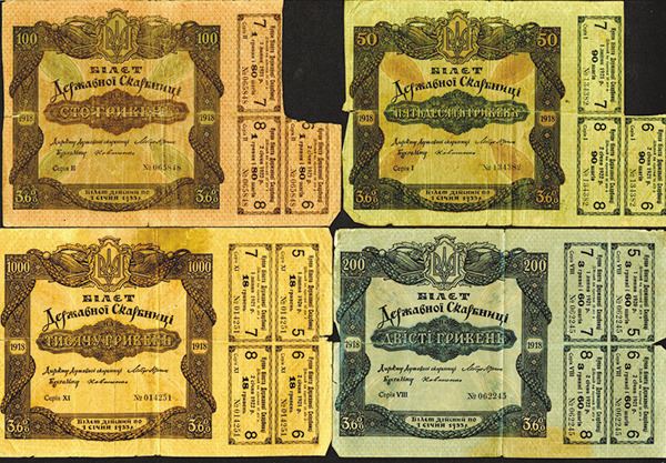 Ukraine. 50, 100, 200, 1000 Hryven. SCWPM 12, 13, 14, 15. Good-Very Good, strong folds. 4 pieces.