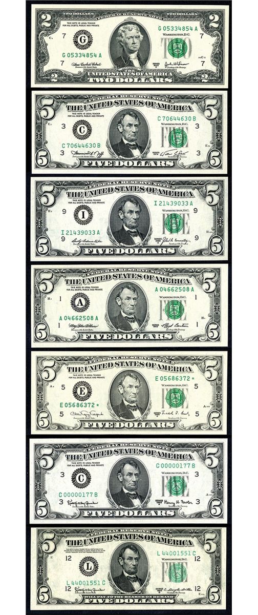 $5 Federal Reserve Note Grouping. 1950-2009. All Certified. $5 1950D FRN 63PPQ; $5 1963A PCGS 67PPQ; $5 1969A PCGS 65PPQ; $5 1974 PCGS 66PPQ; $5 1988A* PCGS 64PPQ; $5 1993 PCGS 64PPQ; $5 2009 PMG 68EPQ; also included is a $2 2003A FRN PCGS 66PPQ. [8]