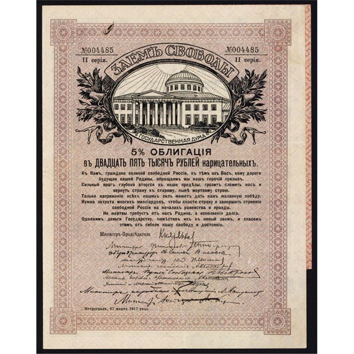 Russia, 1917, , Includes 25,000 Rubles, P-37”I”, Issued, XF-AU, Purple and black with coupons, building in front and coupons attached. Rare high value circulating Freedom Bond in exceptional condition and rarely seen this nice.