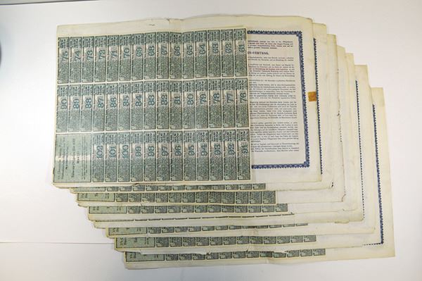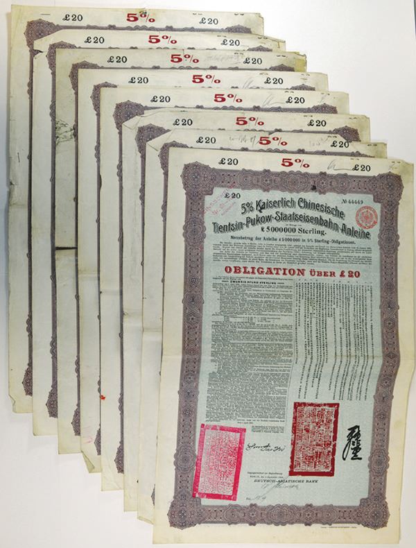China, Imperial. 20 Pounds, purple and green underprint. German and British tax stamps in combination. A few coupons attached. Very Fine. Pencil notations on some. Rough edges. 8 pieces.
