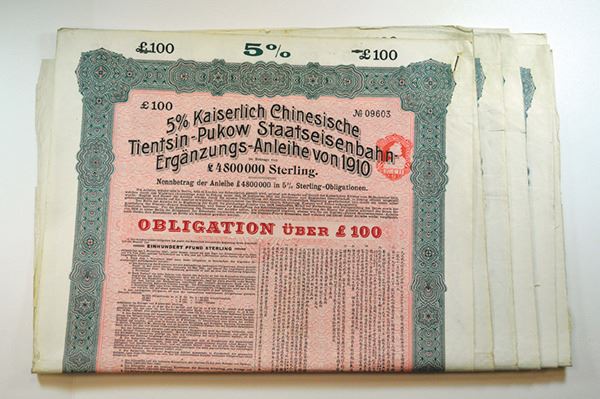 China. 100 Pounds, green border on rose underprint with coupons. G&D. Very Fine. 7 pieces.