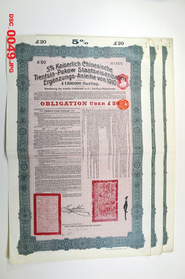 China. Deutsch-Asiatische Bank. Green border and mauve underprint. With Coupons, German and British tax stamp. Large format, rough handling. 4 pieces.