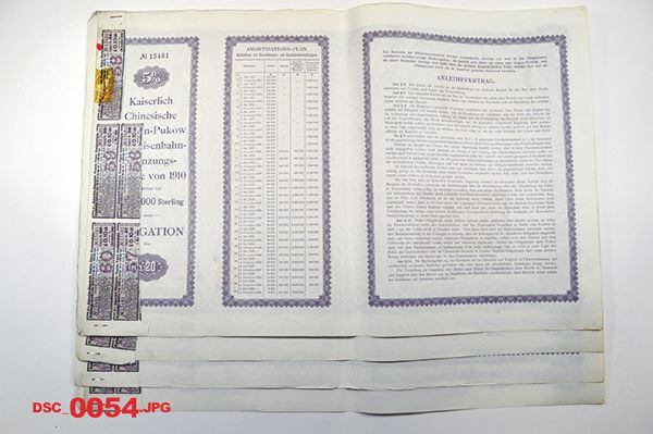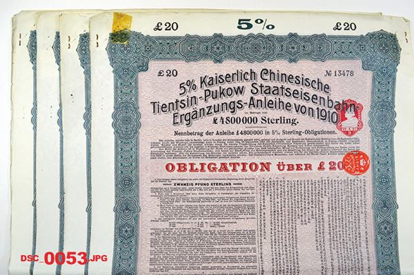 China. Deutsch-Asiatische Bank. Green border and mauve underprint. With Coupons, German and British tax stamp. Large format, rough handling. 4 pieces.