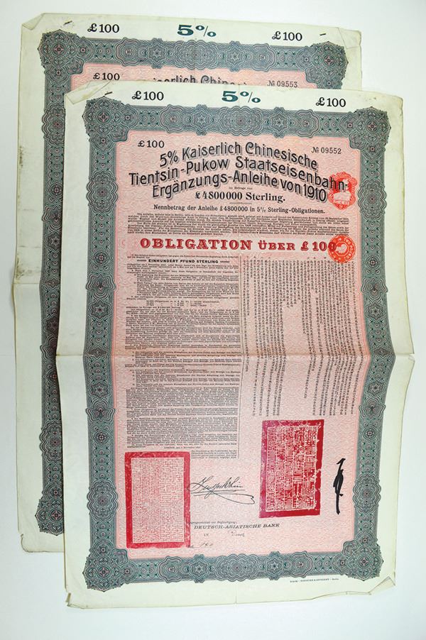 China, Imperial. 100 Pounds, green and pink underprint. German and British tax stamps. A few coupons attached. Rough edges. 2 pieces.