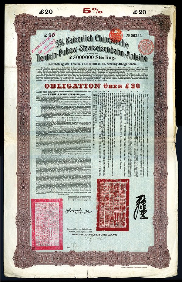 5% Kaiserlich Chinesische Tientsin-Pukow-Staatseisenbahn Loan £20 1908 . Issued in Berlin. Some roughness along the right edge, otherwise VF+.