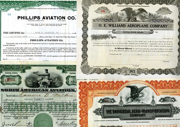 A Collection of Over 200 Different Aviation and Space Certificates. O. E. Williams Aeroplane, Universal Aero-Transportation, Phillips Aviation, North American Aviation, Central Airport, American Airports, American Canadian Airlines, Aeronca Aircraft, Bartlett Aircraft, Ovington Airplane, New England Airlines and many others. Some with wonderful airplane vignettes, some issued, some unissued. Airlines, aircraft manufacturers, lighter than air, helicopters, space and others. Most in excellent condition. Must be seen. Sold as is. Every certificate represents a distinct variety with no duplication and will be cataloged as such in the new Aviation Catalog that is being written by Larry Falater.