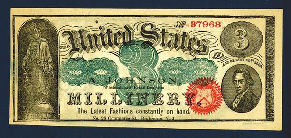 Bridgeton, NJ. Federal mimic Advertising note, $3. XF-AU. Attractive and scarce in high grade.