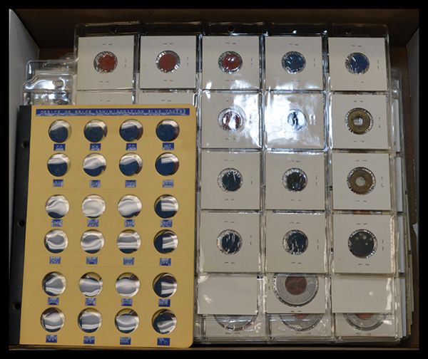 A Large Lot of Interesting Tokens. A Large and varied lot consisting of "Good Luck" pennies, Good Fors, some perhaps questionable "pleasure" tokens, parking tokens, amusement tokens, transportation tokens, tax tokens, ration tokens and many others. [450+], weight approximately 8.5 lbs.