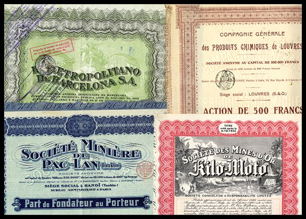 A Large and Colorful Group of Mostly French and Belgian Bonds and Shares. Luna Park de Lyon 1921; Bank of French Africa; Credit Mobillier Indochinois; Tramways Napolitains, Oesterreichenischen Daimler Motoren 1921, and many others. Most in very nice condition. Must be seen. Sold as is. [120+]