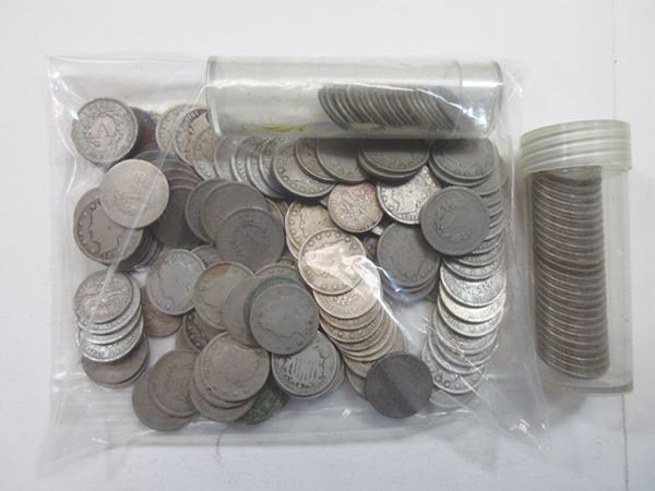 Buffalo Nickels: Twenty-three assorted dates, mostly 1930s, average Fine. Liberty Nickels: a hundred and eighteen average circulated (mostly Good, but about 1/3 are culls. Barber Dime: twenty assorted dates in the 1900s, average Fine or so. Also included are four Roosevelt Dimes and two war nickels. [167] Please inspect, sold "As is" No returns accepted.