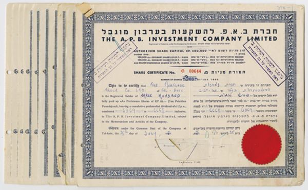 A.P.B. Investment Co. Ltd., 1945-1953 Group of 11 Cancelled Share Certificates.