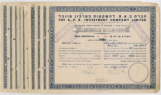 Israelƒ.. Group of 11 I/C Stock Certificates for varying share amounts, Blue print on blue border printed in English and Hebrew, Company title at top in Hebrew and English as well, Cut out cancelled, Fine-VF condition. 11 Pieces.