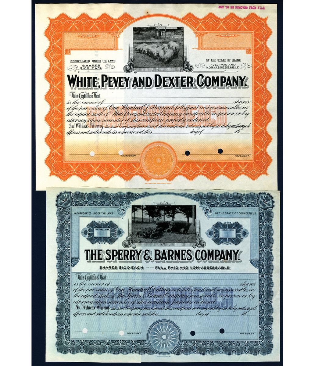 2 different specimen stocks. POC's. Both with photo vignettes of pigs. 1). White, Pevey and Dexter Company, Inc. in Maine; 2). Sperry & Barnes Company, CT. VF condition. Please view unless you want to buy a "pig in a poke". Rare pig farming stocks.