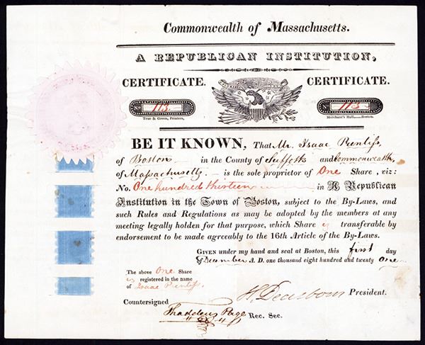 Massachusetts, 1821, 113 Issued Stock, VF-XF condition, True & Green Printers. Signed by Henry Dearborn as president. Minor scattered aging, otherwise VF. Henry Dearborn (1751-1829), was a Revolutionary War General, Congressman and public official. Dearborn was involved in the Battle of Bunker Hill, and saw action at Ticonderoga and Saratoga. He distinguished himself at the Battle of Monmouth, and was on General Washington's staff at Yorktown. Dearborn, Michigan, is named in his honor. A Republican Institution was organized to provide a forum for political education and discussion as a means of promoting the national welfare. A rare and important stock relating to a political organization.